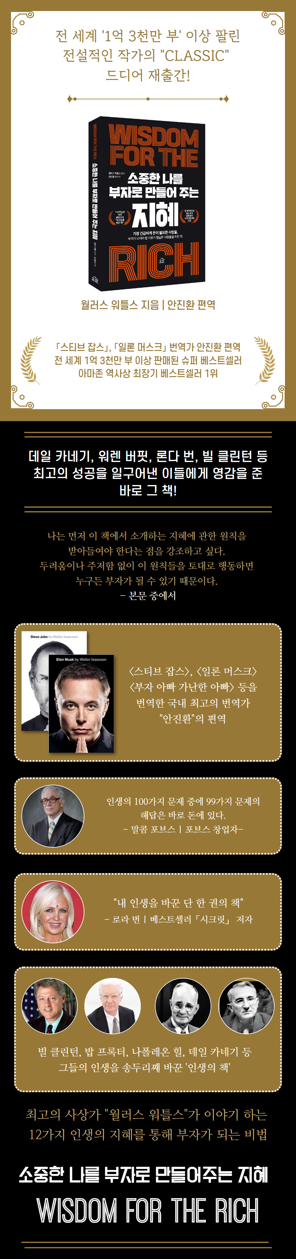 『소중한 나를 부자로 만들어주는 지혜』는 초판 발행 이후 전 세계적으로 천만 부가 넘게 팔린 베스트셀러로, 자기계발서의 고전으로 꼽힌다. 저자 월러스 워틀스는 세상을 둘러싼 긍정의 에너지를 자기 안으로 이끌어내는 원리를 터득하였으며, 그 원리를 실천하여 커다란 성공을 거두었다. 자기계발 분야의 대표적 선구자인 그는‘성공철학의 거장’ 나폴레온 힐, ‘영혼을 울리는 이야기의 달인’ 로버트 슐러, 『시크릿』의 론다 번, ‘세계에서 가장 뛰어난 인물 10인’에 선정된 앤서니 라빈스, 데일 카네기, 혼다 켄, 빌 클린턴 등 유명인사들에게 많은 영감을 주었다. 이들은 월러스 워틀스가 이끌어낸 원칙을 실천하여 모두 눈부신 성과를 얻은 것으로도 유명하다.