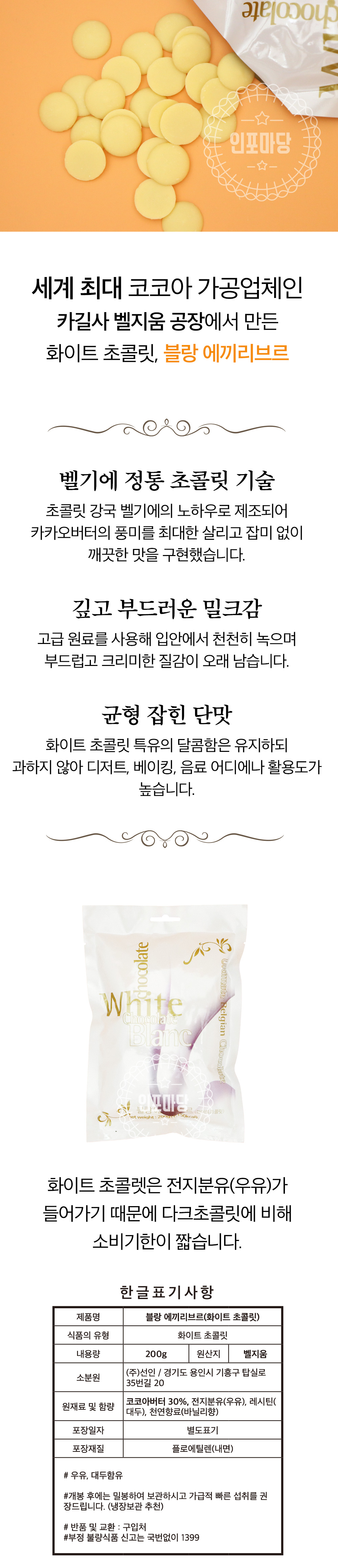 카길 화이트초콜릿 200g (카카오함량 30%, 론도형태)
