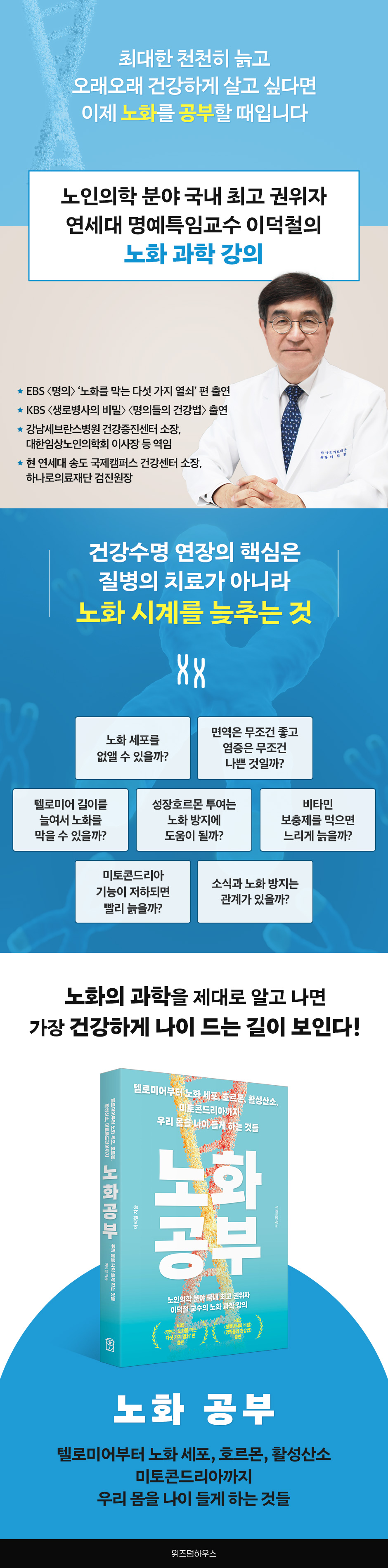 노화의 근본 원인과 기전을 알고 이해하는 것은 노년의 건강과 행복을 위해 필수적이다. 특히 전 세계적으로 유례를 찾아볼 수 없을 정도로 급속히 초고령사회로 이행하고 있는 우리나라에서 노년의 건강과 질병 예방은 급격한 의료비 상승으로 인한 사회적 부담을 줄이는 최선의 방법이 된다. (본문 중에서)